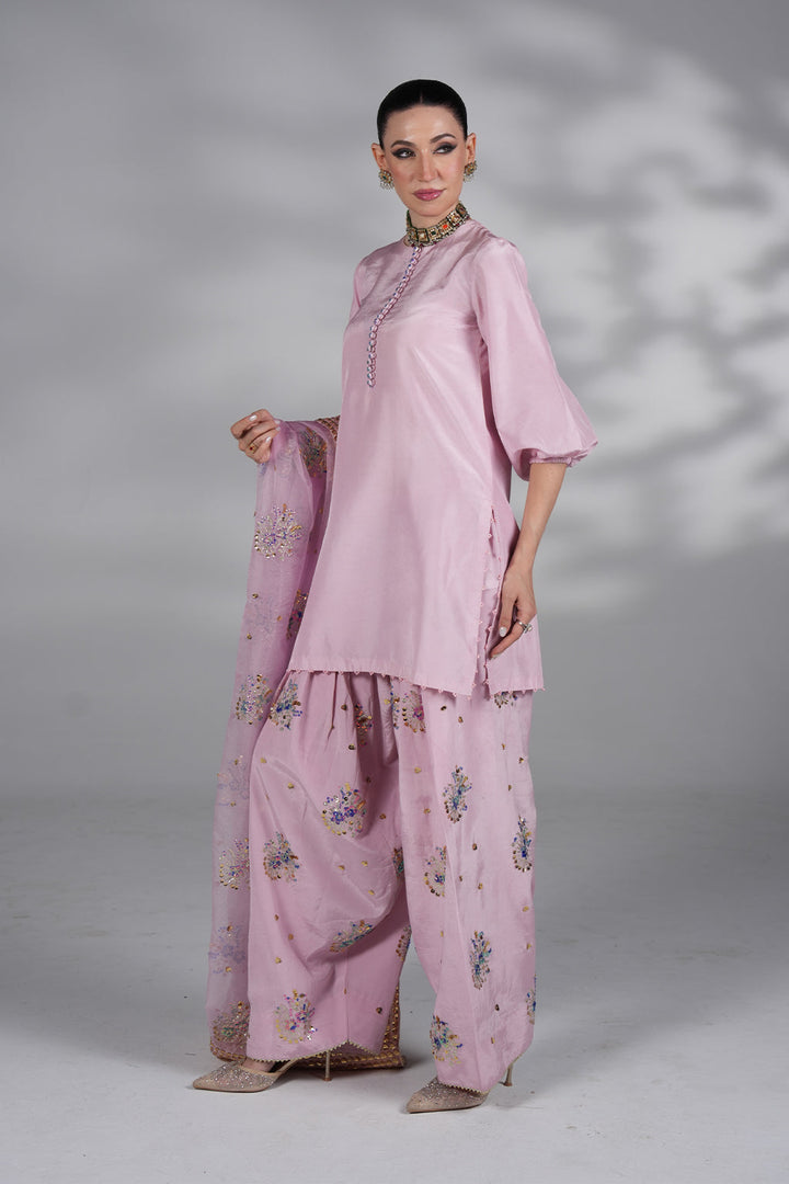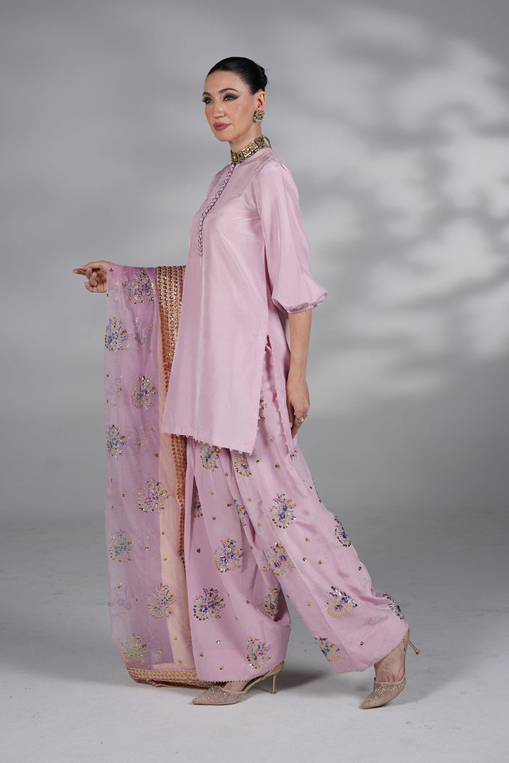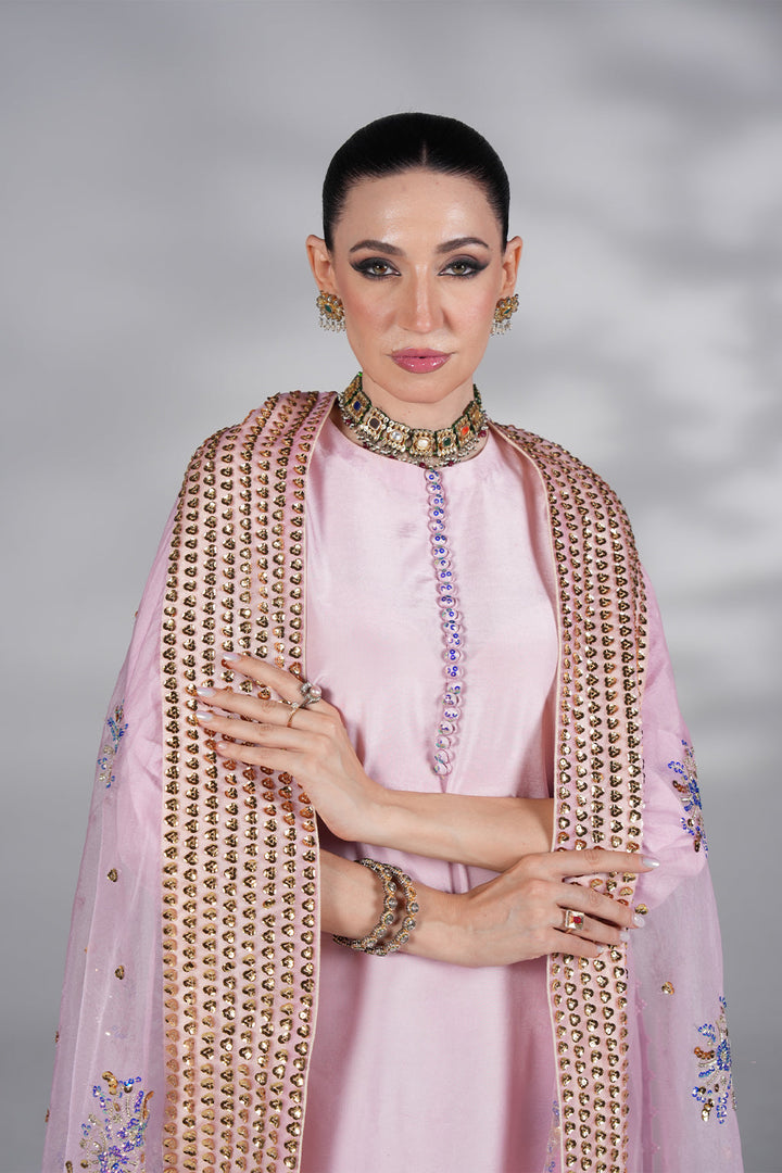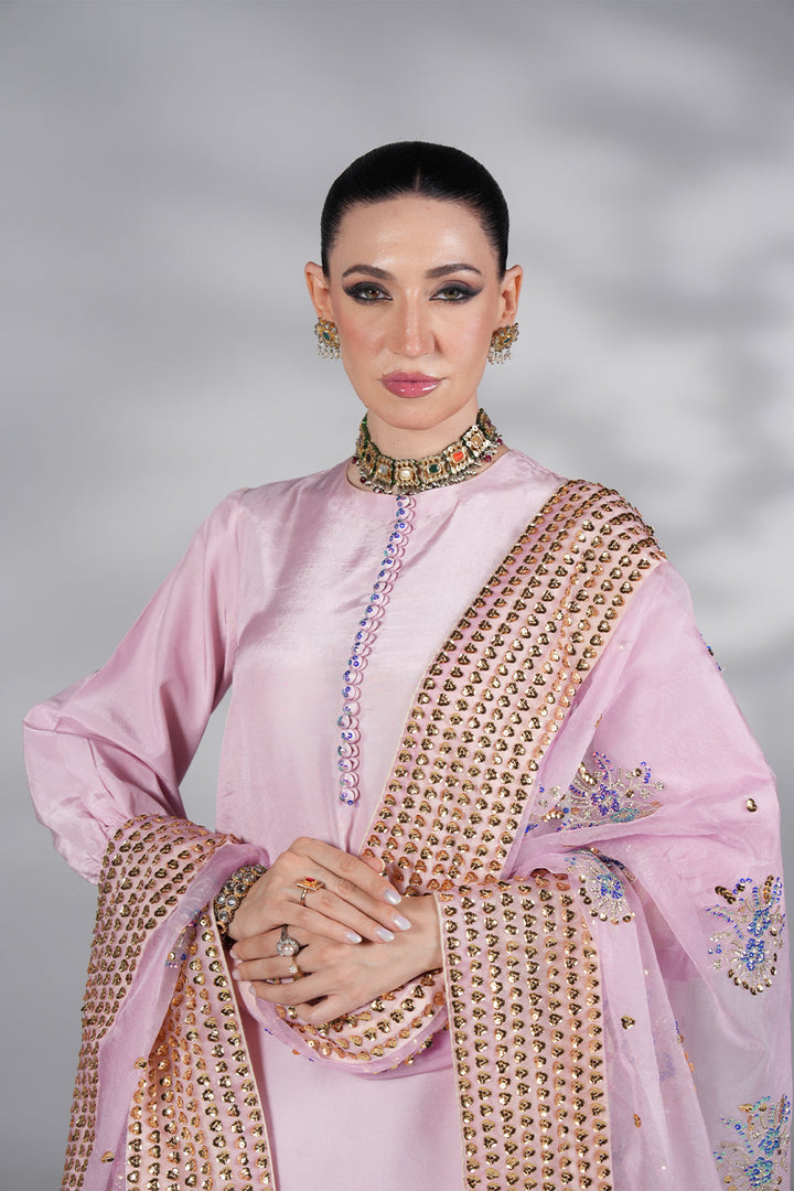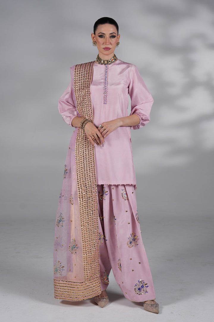 Premium silk shirt with hand embellishments, farshi shalwar with intricate handwork, and chiffon dupatta – a lilac dream for festive evenings.