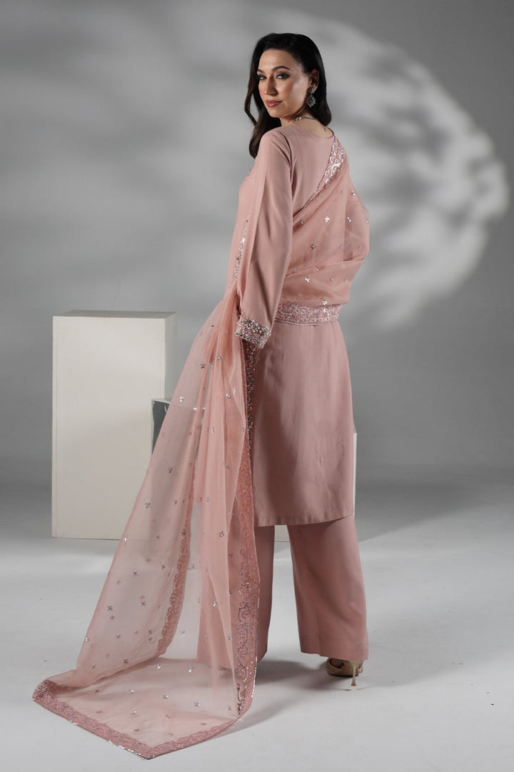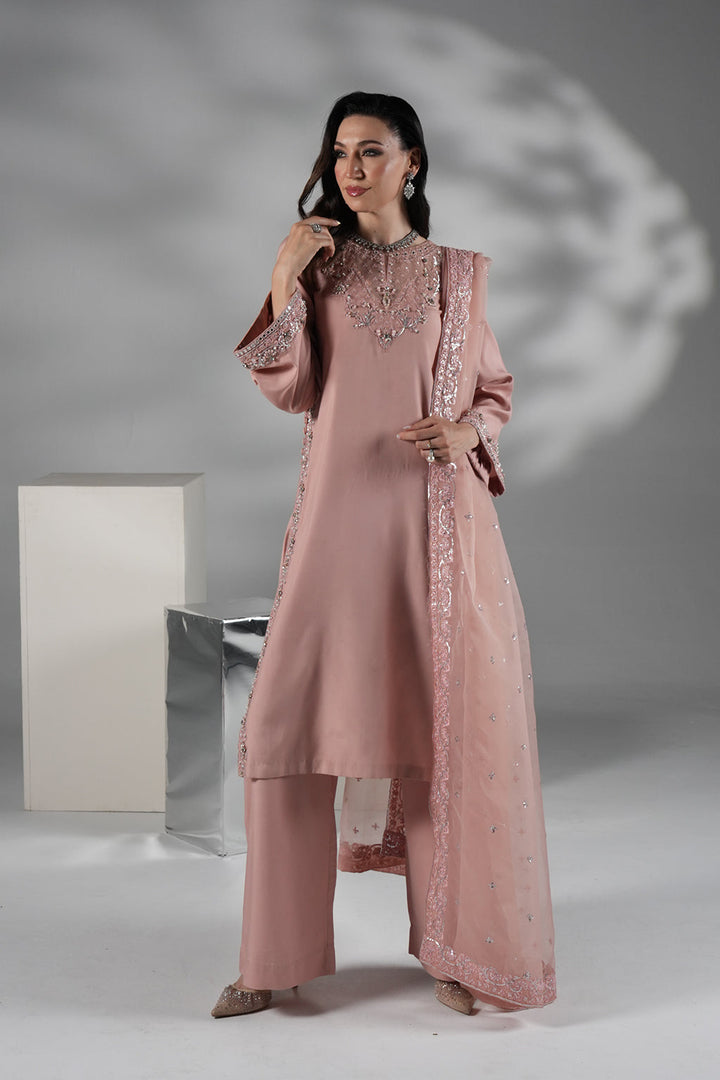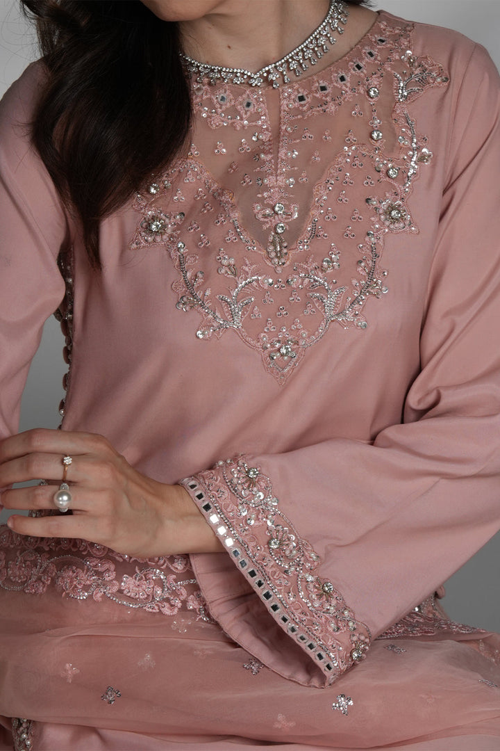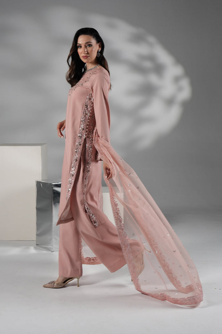 Elegant rose gold ensemble featuring hand embroidery on shirt & shalwar, finished with a chiffon dupatta and hangings.