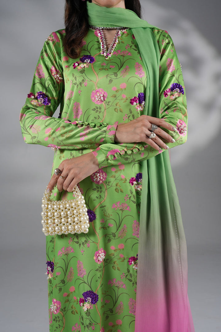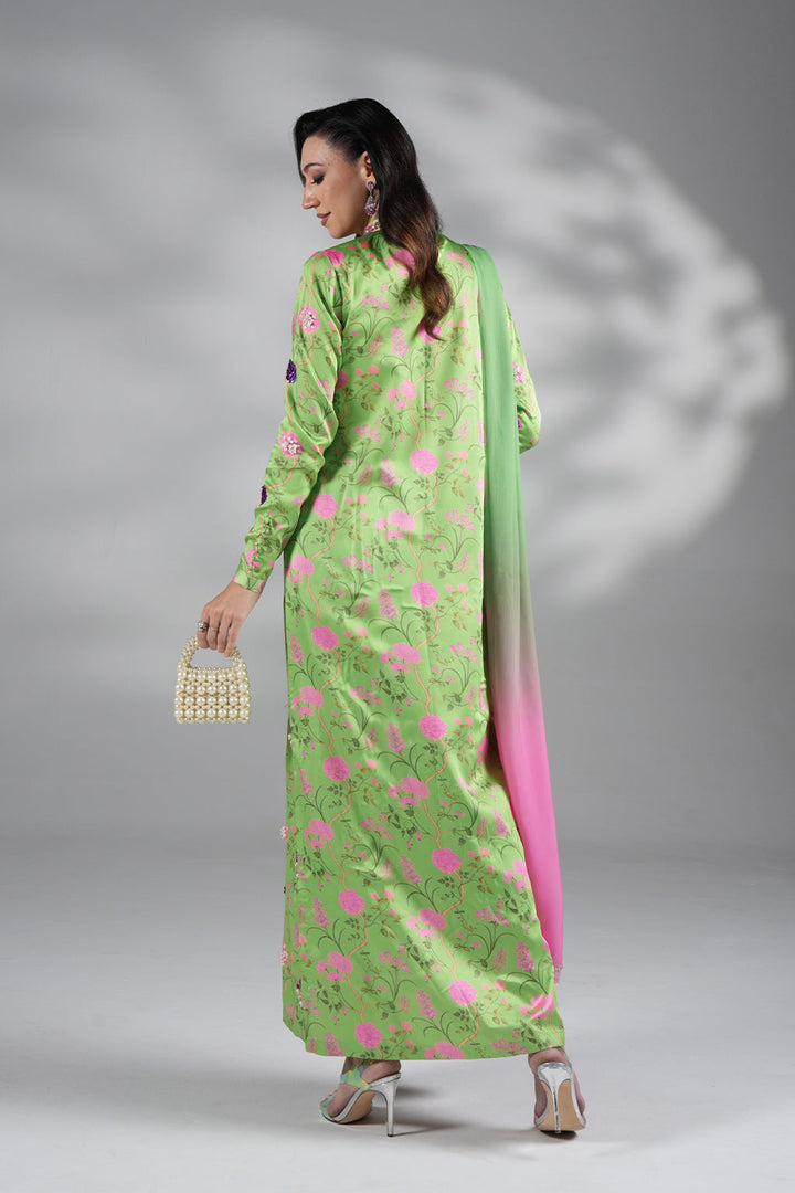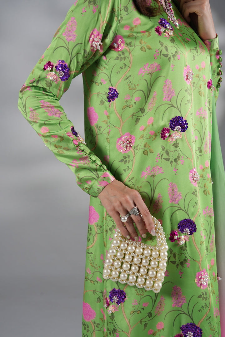 Vibrant printed green charmeuse ensemble with handwork detailing on shirt and matching trouser.