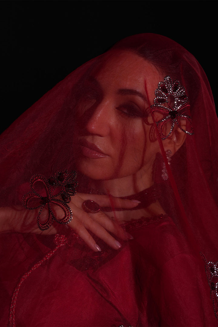 Shirt: Red silk shirt with embroidered neckline and hand-embellished sleeves, finished with fine detailing